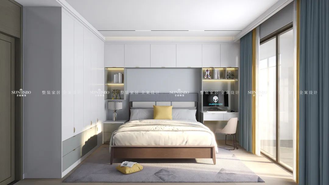 原色的木地板、浅灰的衣柜,搭配简约的背景墙,整个空间都呈现着祥和静谧的氛围。游走的光影,绝佳的开阔视野,使得空间充满无限张力。黄绿拼接的窗帘,配合柔和的层板灯,营造舒适温馨的起居氛围。